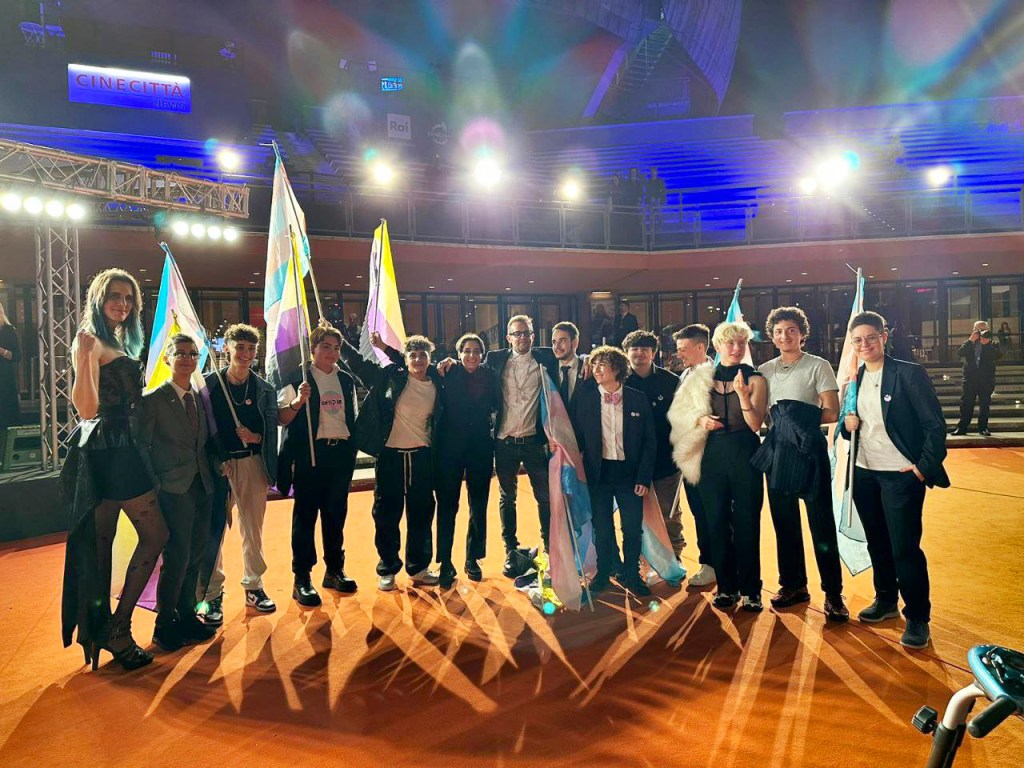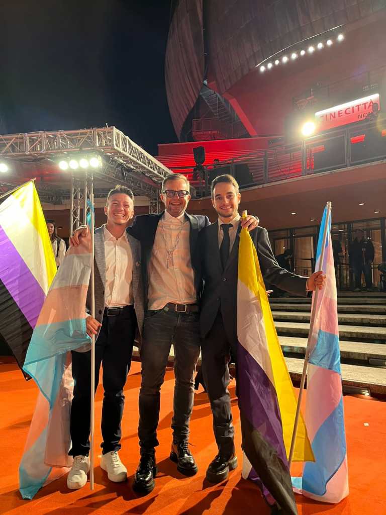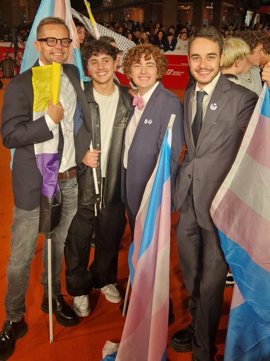Siamo noi, che, insieme ai membri del cast, tutte persone trans binarie e non binarie, abbiamo marciato con indescrivibile gioia ed emozione sul tappeto rosso dell’Auditorium sotto gli occhi di centinaia di persone; noi che con i nostri corpi abbiamo affermato la nostra esistenza e dimostrato che Orlando è uscito dalla finzione, Orlando è reale.